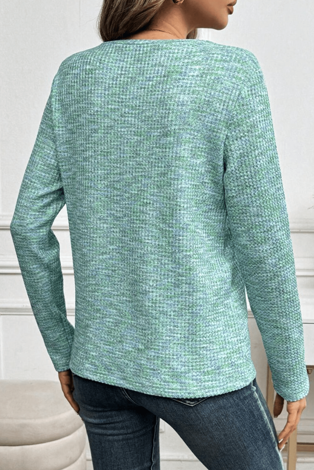 Moonlight Jade Buttoned V Neck Textured Knit Long Sleeve Top