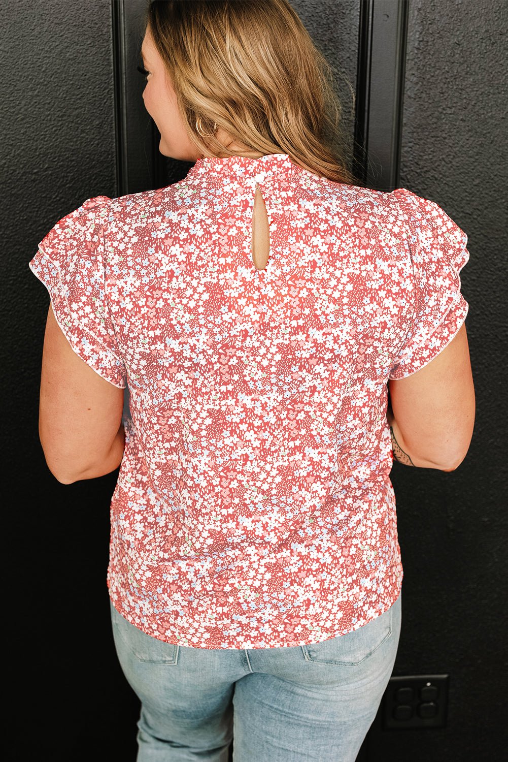 Pink Plus Size Floral Patchwork Ruffled Short Sleeve Blouse