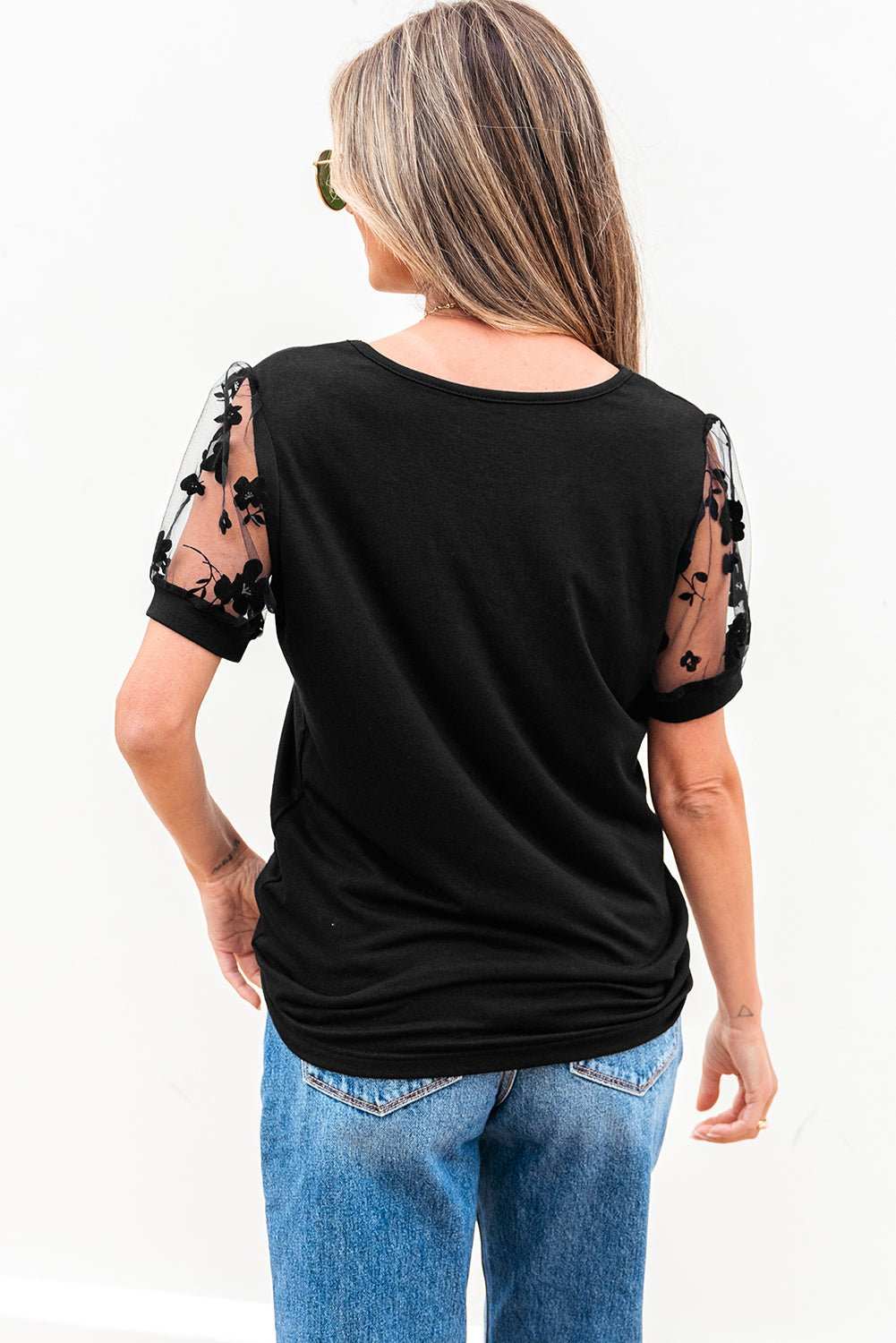 Black Floral Sheer Mesh Short Sleeve Mock Neck Blouse
