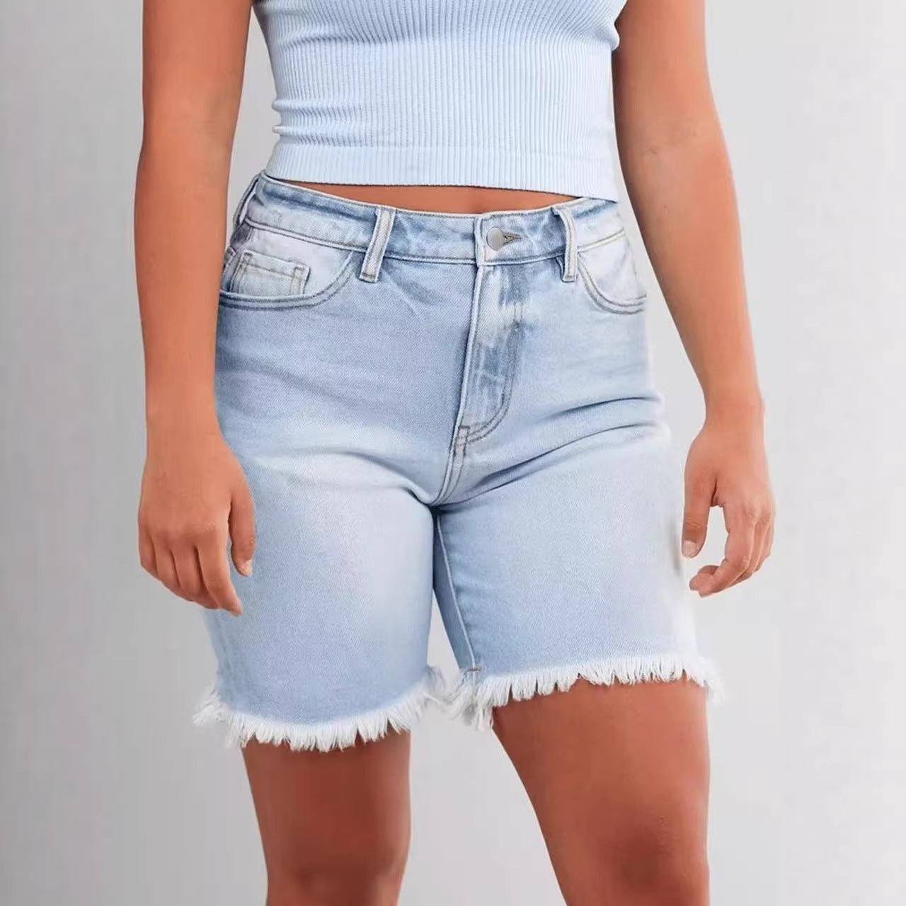 New Straight-fit Slimming Ripped And Frayed-edge Denim Shorts
