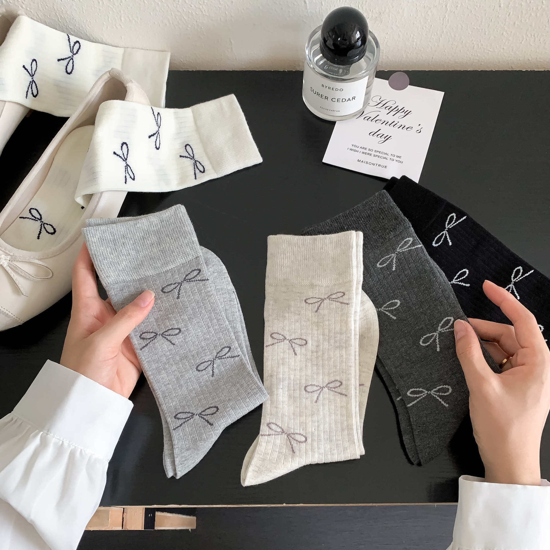Three-dimensional Curling Polka Dot Bow Female Ballet Style Pure Cotton Mid-calf Length Socks