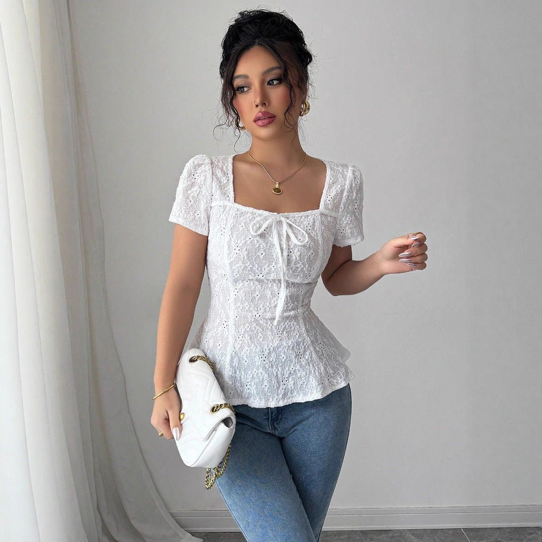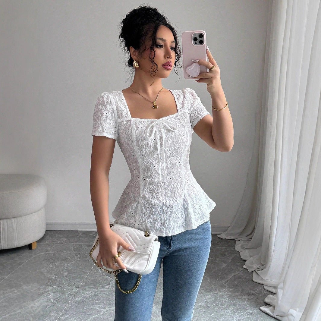 Casual Lace Blouse With A Square Neckline And Bow-tied Short Sleeves