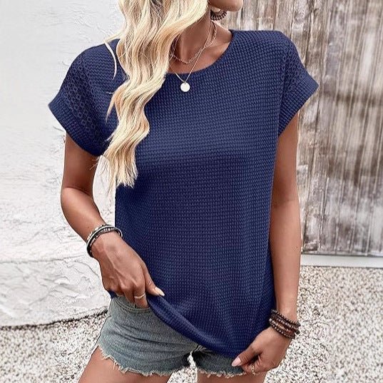 Women's Round-neck Waffle Knit Lace Cutout Short-sleeved Shirt