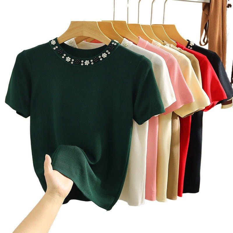 Round Neck Heavy Industry Ice Silk Short Sleeve T-shirt Female Spring And Summer Elegant Knitwear