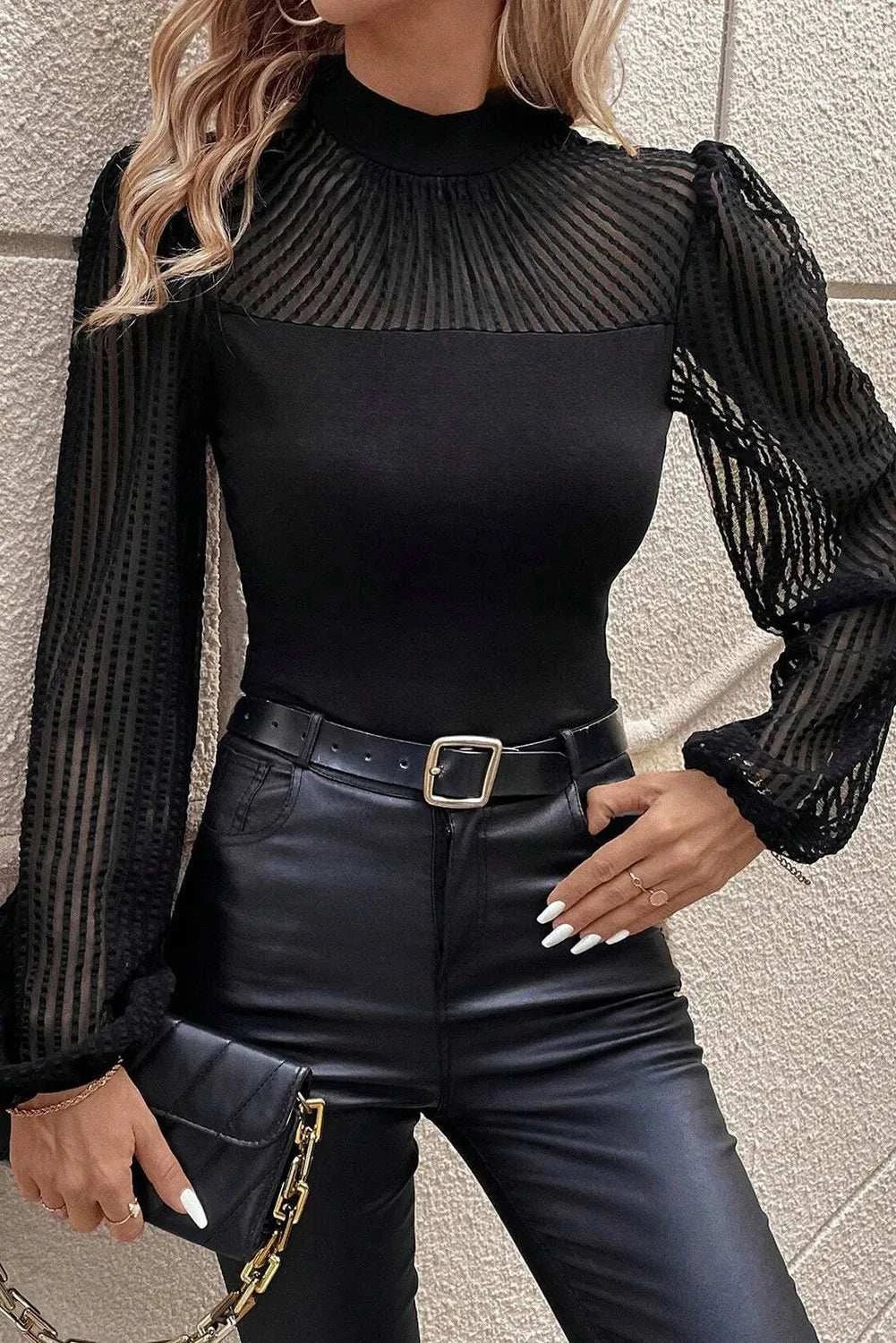 Mock Neck Long Sleeve Blouse with Pleated Detail