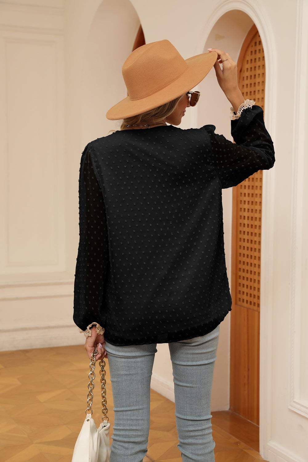 Swiss Dot Contrast V-Neck Blouse
